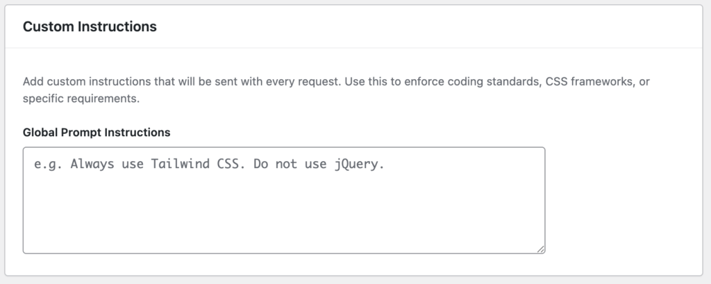The Custom Instructions field lets you define a global set of rules that SurgeWP will automatically include with every AI request. Use this to keep outputs consistent across your team, enforce coding standards, and reduce “AI randomness” between blocks.